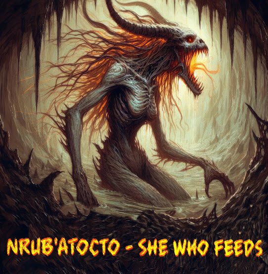Professor Algernon Ross clutching a glowing yellow lantern ventures into the endless midnight of remote, subterranean tunnels. There he stumbles upon the tomb of the primeval demon Nrub'atocto, imprisoned in this nameless cavern for 917 years. Over the slow march of centuries, her malevolent essence has seeped into the encompassing stone, soil, and underground rivers. As Algernon raises his lantern, its wan light reveals the demon's hibernating form still and statue-like. He comprehends the evil that has been gradually diffusing out from this forgotten place deep under the earth. Part of the Nrub'atocto - She Who Feeds storyline.